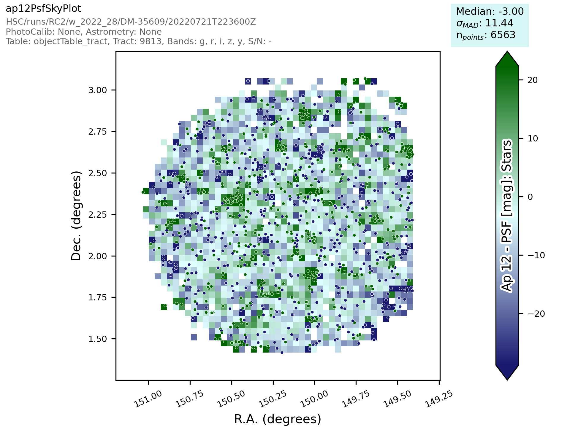 Plots the values of the parameter given for the z axis according to the positions given for x and y. Optimised for use with RA and Dec. Also calculates some basic statistics and includes those on the plot.
