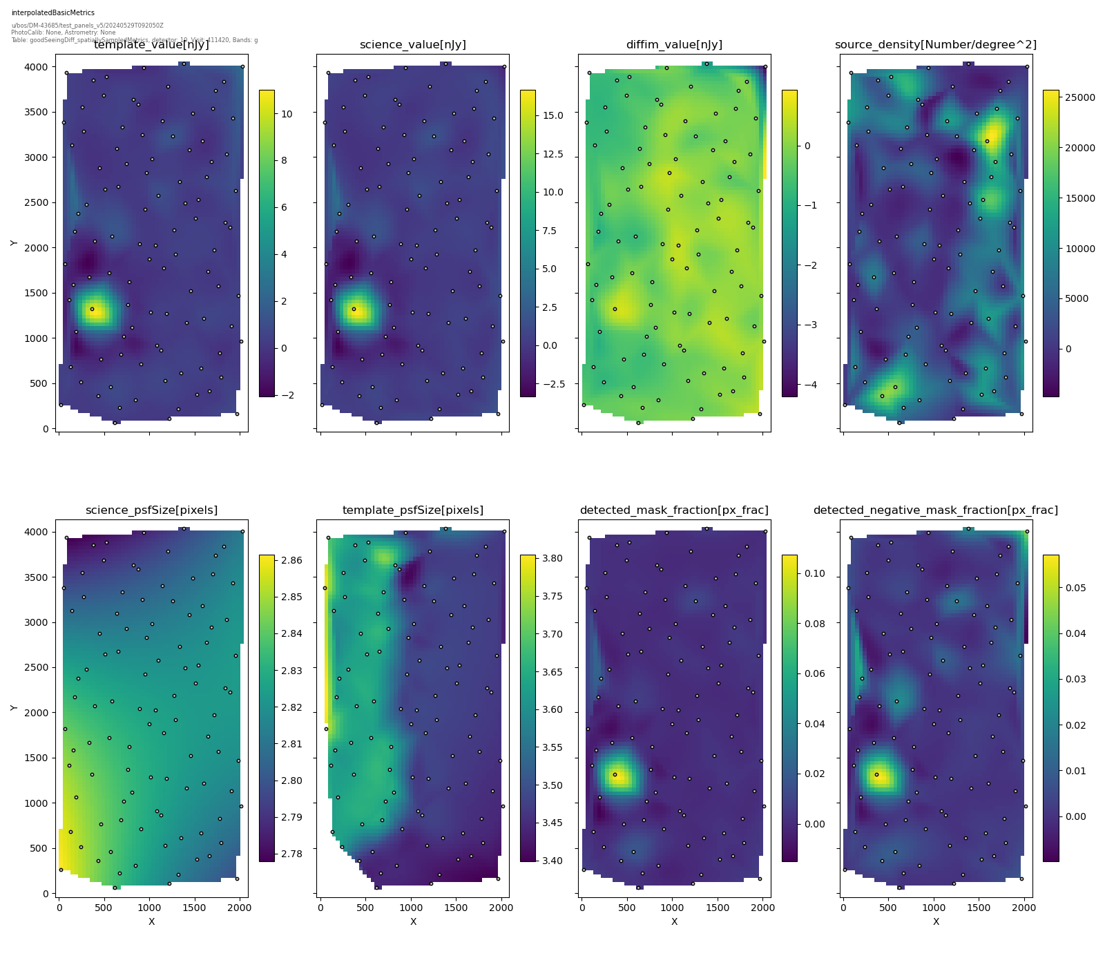 The provided list of metric names and labels enables the creation of a multi-panel plot, with the 2D interpolation of the input metric values sampled on the given detector x and y coordinates. The interpolation evaluation grid can be controlled with the margin and number of grid points.