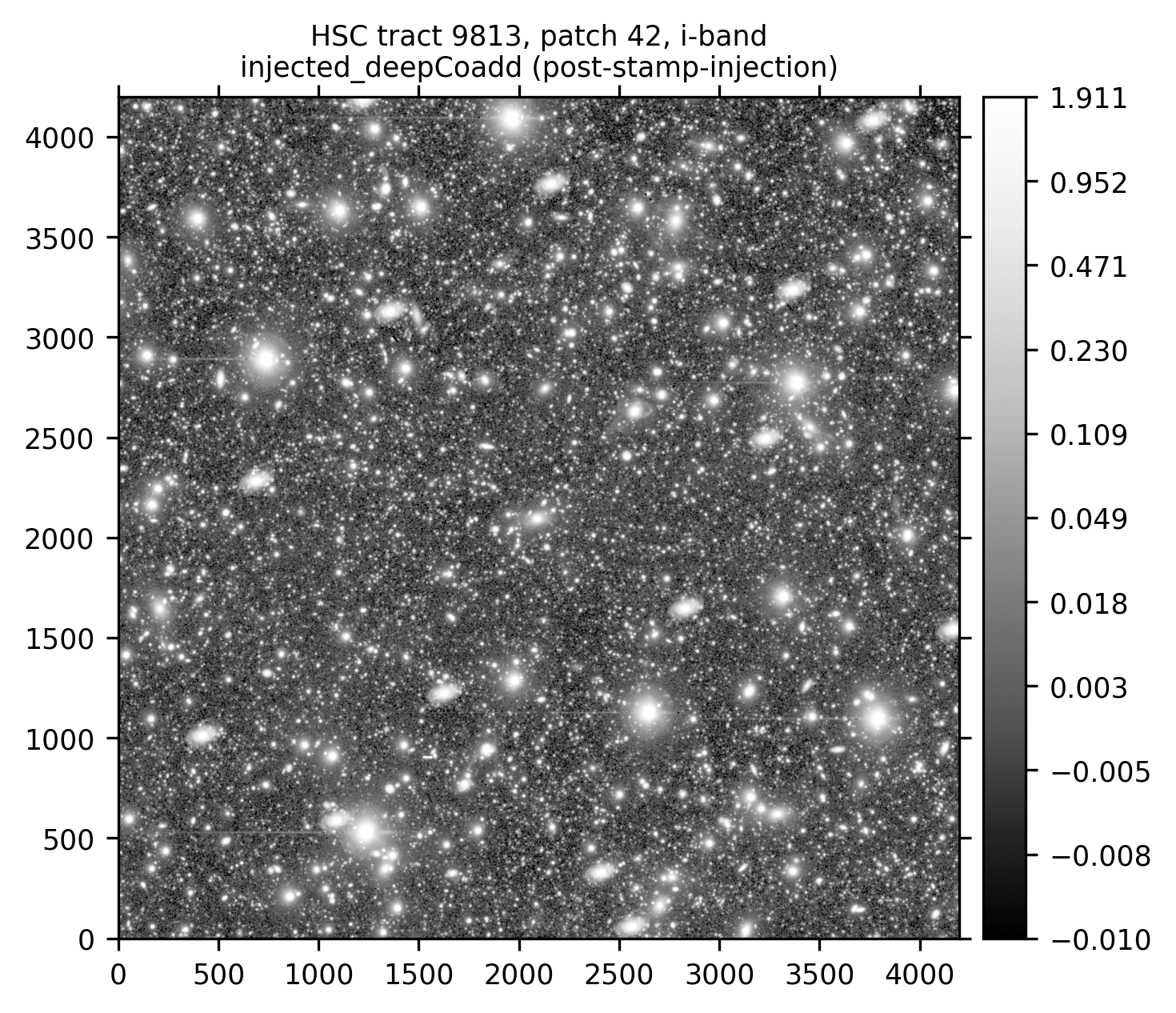 Finally, lets inject our postage stamp multiple times into the HSC i-band tract 9813, patch 42 image: