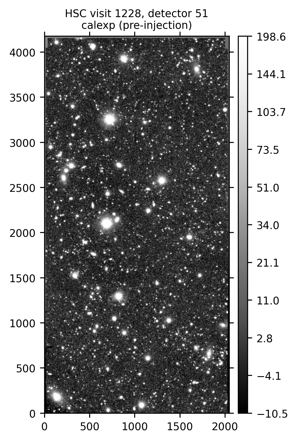 Calibrated exposure (calexp and injected_calexp) data for HSC visit 1228, detector 51, showcasing the injection of a series of synthetic Sérsic sources.