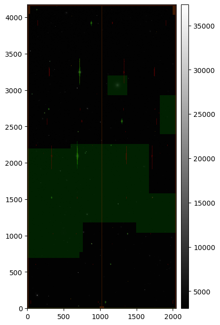 For example, lets mask all mask planes except the INJECTED mask plane, and lets change the scaling for the science image to asinh zscale scaling: